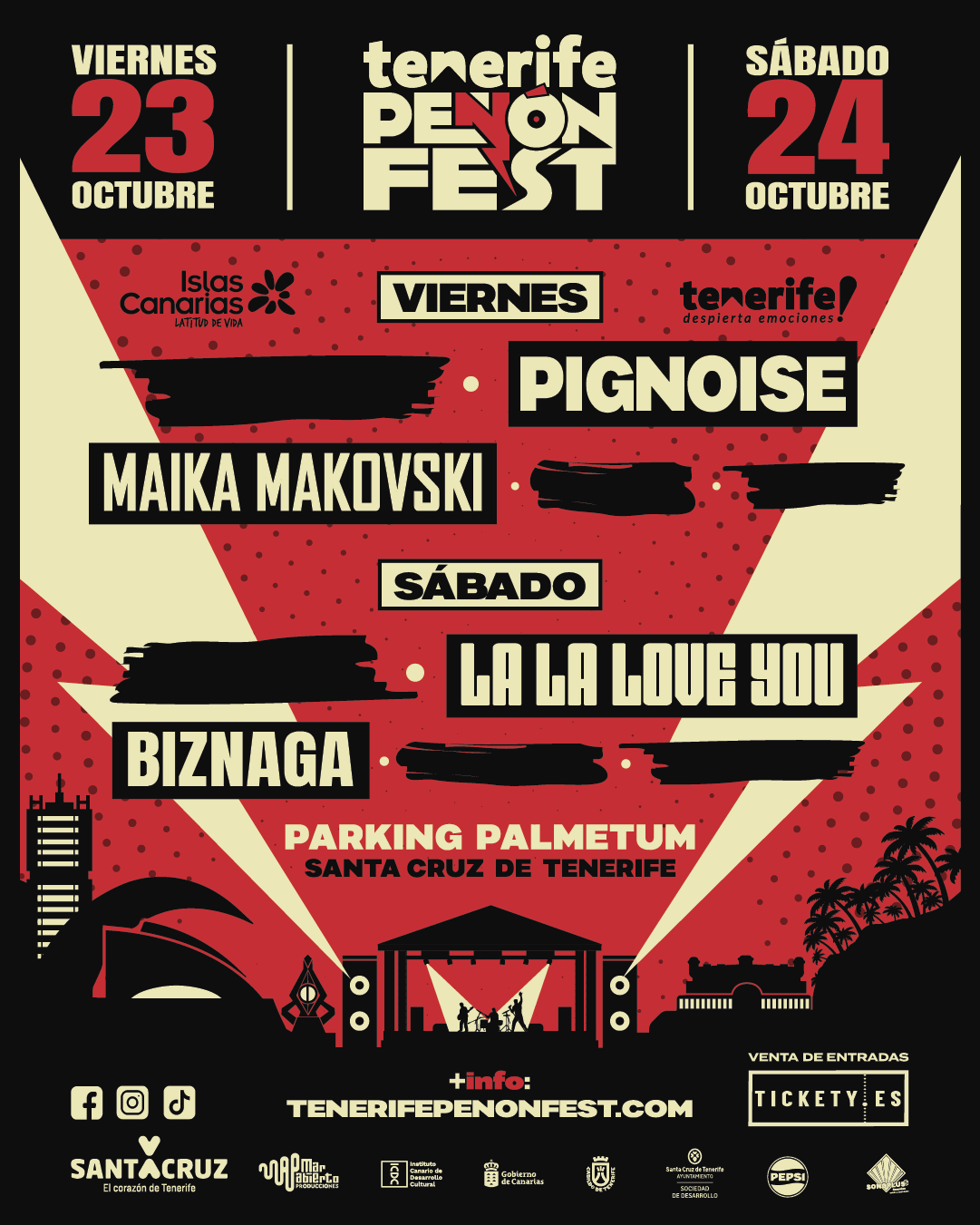 El Tenerife Peñón Fest continuará ofreciendo el mejor pop-rock e indie de la escena musical española con el anuncio de los artistas La La Love You, Pignoise, Biznaga y Maika Makovski para los próximos 23 y 24 de octubre de 2026. La novena edición ofrece una programación de actividades culturales en la semana previa al evento, más horas de música, mayor oferta gastronómica en la zona de foodtrucks y un recinto ampliado en el parking del Palmetum de Santa Cruz de Tenerife. El cartel de artistas al completo será anunciado próximamente. Más información en las redes sociales del festival y en www.tenerifepenonfest.es.
